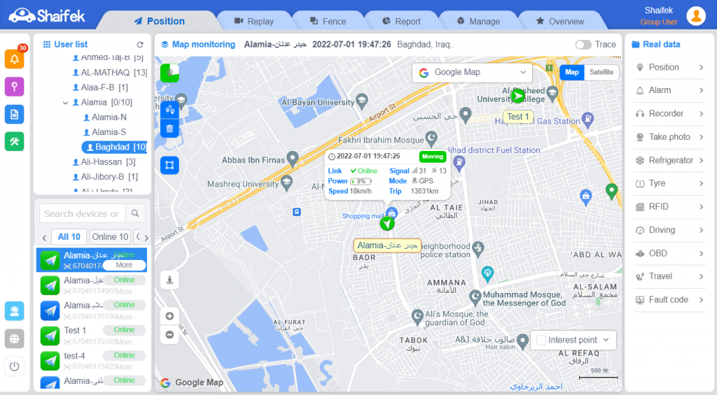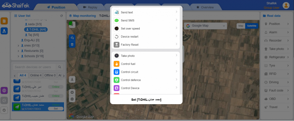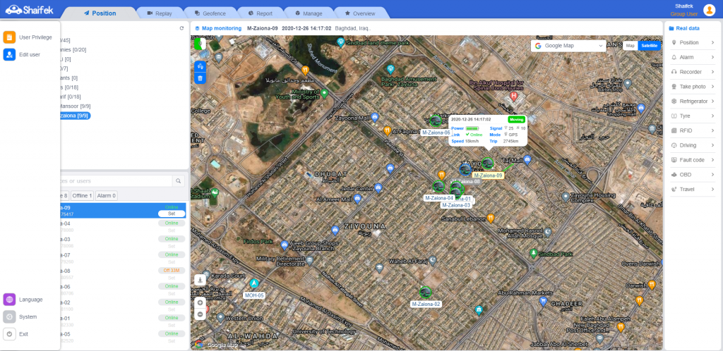 1- تحديد موقع المركبة Real time tracking, مما يمكنك من متابعة مركبتك لحظة بلحظة. وبالمكان استخدام خرائط Google Map كما يمكن استخدام 5 أنواع اخرى من الخرائط اضافة الى امكانية استخدام خلفية الصور الفضائية.