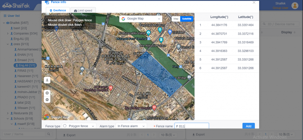 4- تحديد المسار او منطقة العمل وتلقي اشعارات حين تجاوزه. تحديد منطقة العمل لكل مركبة واستلام اشعار حين تتخطى المركبة المنطقة المحددة لها, وبذلك تكون ضمنت ان المركبة تؤدي واجبها.