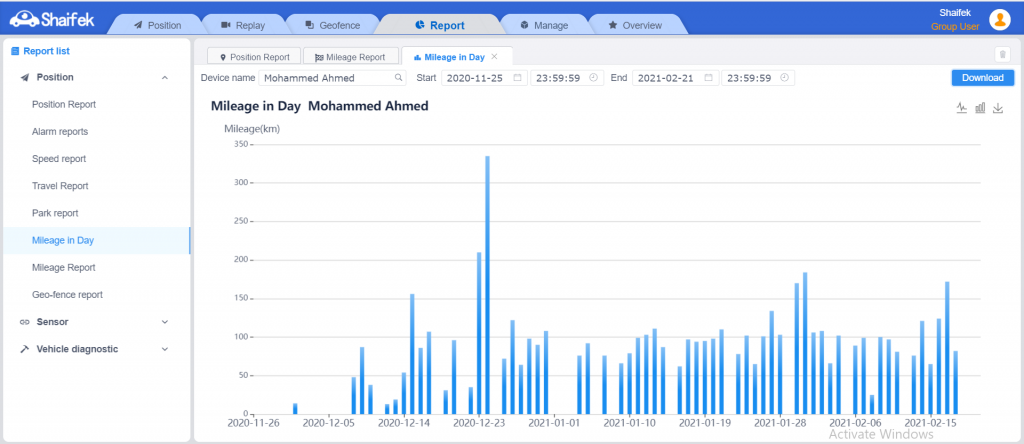 8- تقرير المسافات اليومية: نحدد تاريخ البداية والنهاية وبالإمكان إخراجها كجدول Excel يعرض لنا المسافة التي قطعتها كل سيارة في كل يوم , ومن خلال ذلك يمكن تقدير استهلاك الوقود. علما اننا بإمكاننا إضافة متحسس خاص لحساب استهلاك الوقود بشكل اكثر دقة وليس تخمينيا.