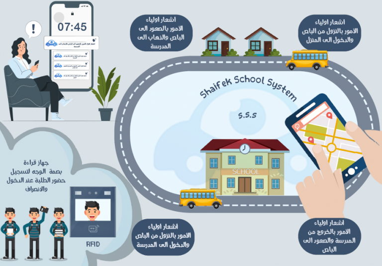 Today, the school administration needs to take into account the safety of students and invest in applications that ensure their follow-up to and from school, so our company has developed the Shaifek Schools System (SSS) is an easy-to-use application that works on the mobile phone and computer and combines a GPS vehicle tracking system and an RFID face ID system to log in and out of students to the bus and school, and provides many effective features for parents and school management to ensure safe transportation for students